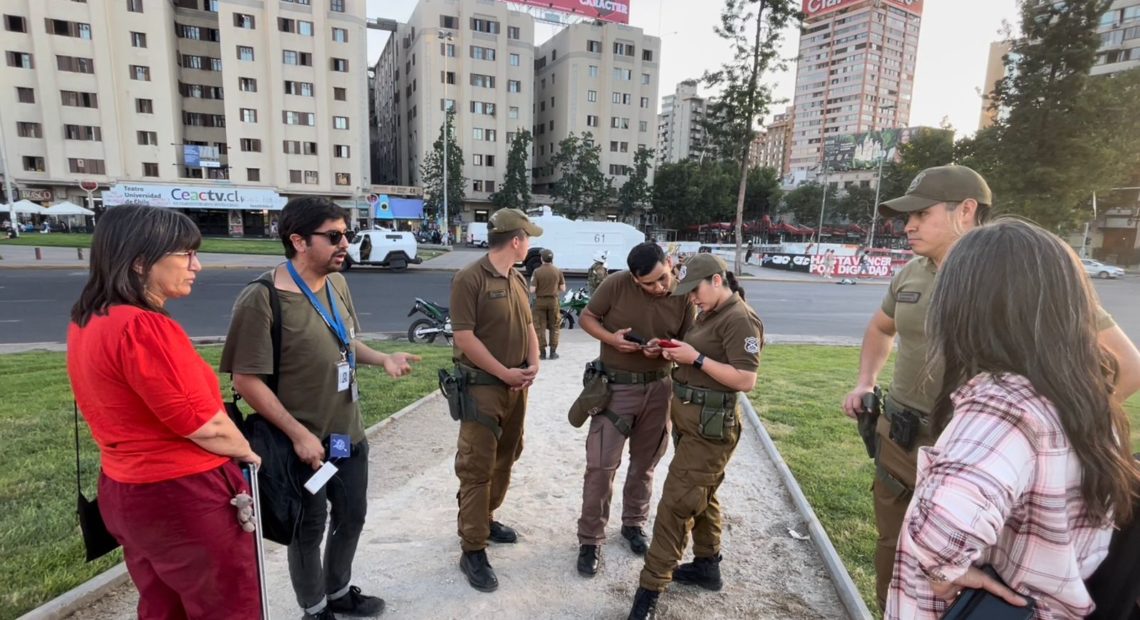 Todo esto ocurría mientras otros transeúntes e incluso turistas, cruzaban a la remozada Plaza para fotografiarse, razón que hace inferir a las afectadas, una acción dirigida a quienes pretendían grabar un video sobre la temática que más sensible resulta a la Institución de Carabineros: Derechos Humanos.