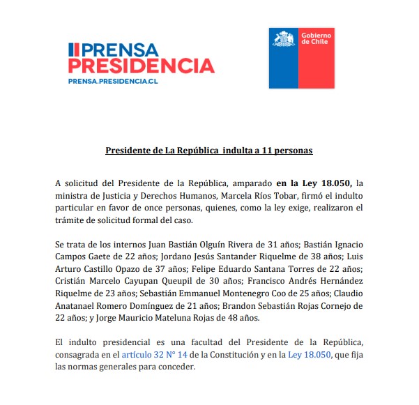 Los beneficiados por el indulto son los presos Juan Bastián Olguín Rivera (31 años), Jordano Santander Riquelme (38 años), Felipe Santana Torres (22 años), Cristián Cayupán Queupil (30 años), Francisco Hernández Riquelme (23 años), Bastián Campos Gaete (22 años), Luis Castillo Opazo (37 años), Sebastián Montenegro Coo (25 años), Claudio Romero Domínguez (21 años) y Brandon Rojas Cornejo (22 años). A esta Jorge Mateluna, quien cumplía una condena de 16 años en prisión luego de ser acusado de participar en un asalto a un banco de Pudahuel en junio de 2013.