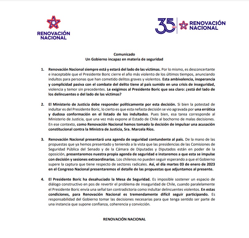 Como era de esperar, el indulto indignó a las derechas. Renovación Nacional emitió a los pocos minutos un comunicado en el que anuncia una acusación constitucional contra la ministra de Justicia, Marcela Ríos y su retiro de la mesa de Seguridad.
