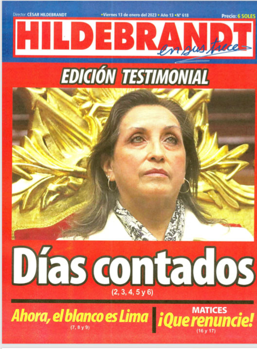 El principal reclamo en juego es la renuncia de Boluarte, que gana respaldo y plantean incluso las organizaciones de derechos humanos, lo que llevó al semanario Hildebrandt en sus 13 a afirmar que el gobierno tiene los días contados, por la alta mortandad, la vastedad de las protestas y la ausencia de otras salidas.