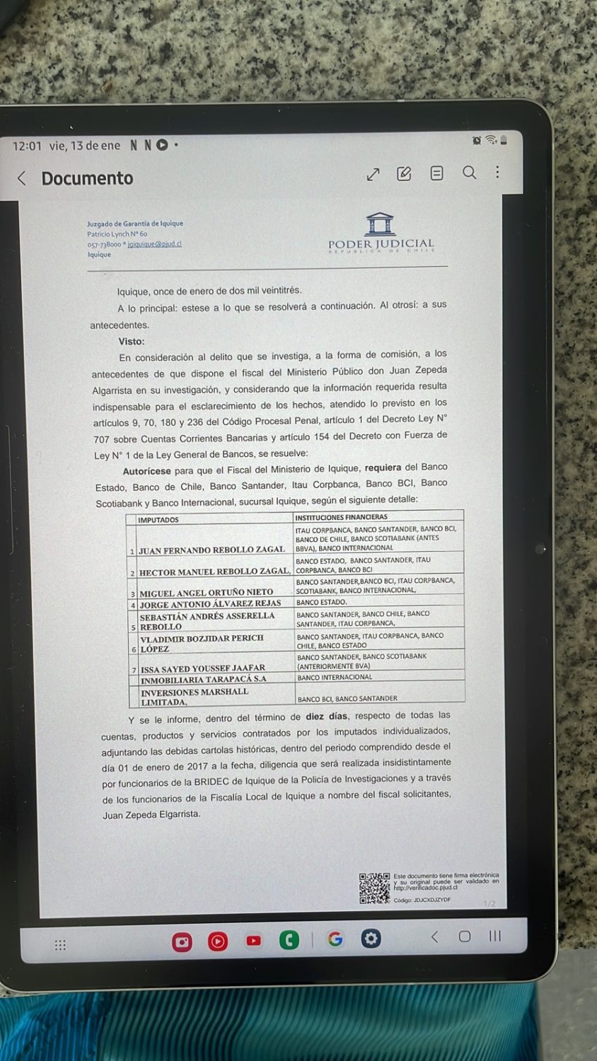 La Fundación Defendamos la Ciudad informó que con fecha 11/01/23 el Juzgado de Garantía de Iquique autorizó al fiscal del Ministerio Público, para que, con la asistencia de la BRIDEC de la Policía de Investigaciones de esa ciudad, investigue en el sistema financiero los movimientos de dinero de los socios de ese club de tenis, teniéndose en cuenta que dicho club era una persona jurídica sin fines de lucro.