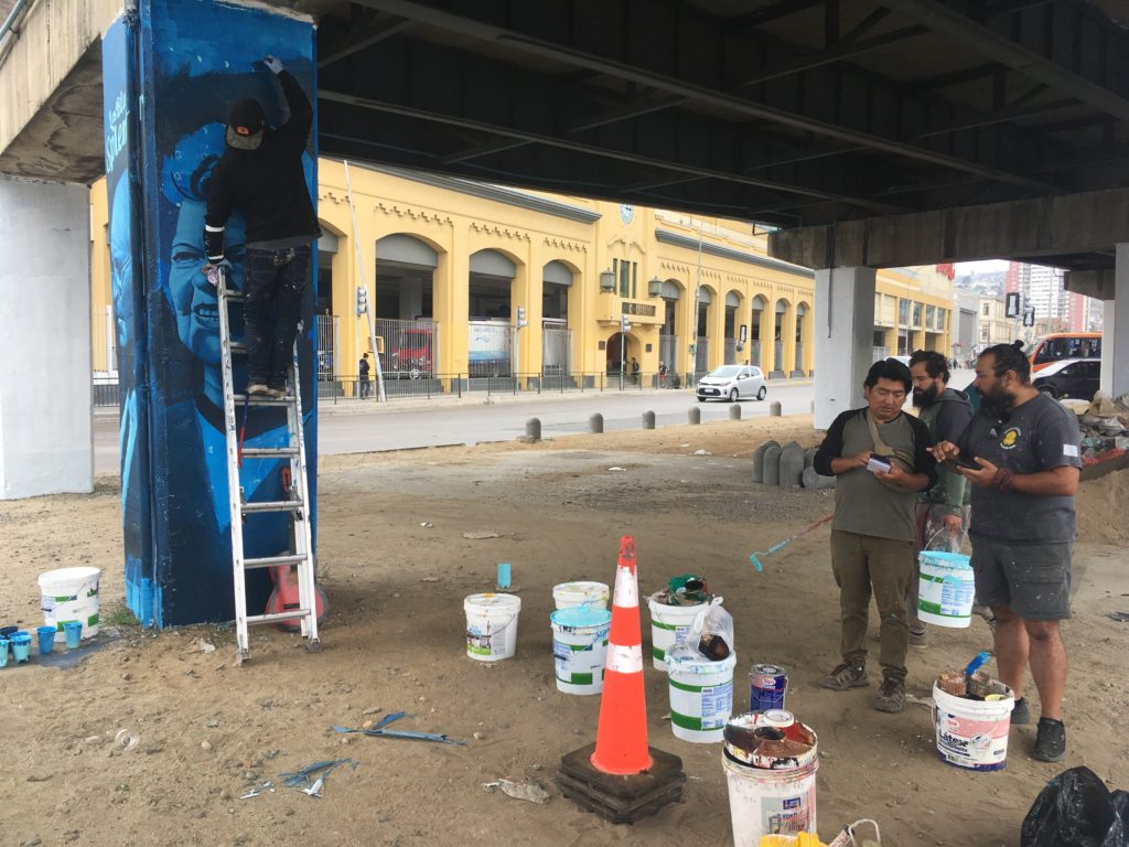 “Claro, acá van a ir los músicos. En el origen del proyecto estaba plasmar el trabajo de los obreros, de los trabajadores, pero varió un poquito como se presentó ese problema que hubo con los artistas locales, pero encontramos que igual estaba bien lo que dijeron, porque es un bonito espacio para darle valor al artista popular porteño. Como todo es flexible, hicimos calzar ambas cosas, a los artistas y a la gente común. Por ejemplo, allá en los pilares hacia la estación pintamos a una señora que trabaja en Caleta Portales. Le tomamos una fotografía y después la pintamos acá. Seguramente se va a llevar una linda sorpresa cuando se reconozca en ese mural, y eso es bonito”