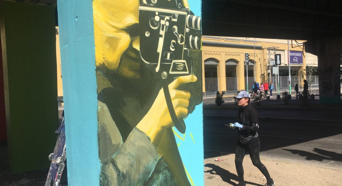 En un costado del pilar, Cindy ha plasmado la imagen de Aldo Francia en plena acción con su máquina filmadora. Conversando con ella corroboro lo que ya me había relatado Samir, que estudió Bellas Artes en la Universidad de Chile de Santiago y se viene integrando recién a este proyecto. Al comentarle lo bien que quedó la imagen de Aldo Francia me responde que admira mucho sus películas y no se cansa de ver “Valparaíso mi Amor” y “Ya no Basta con Rezar.