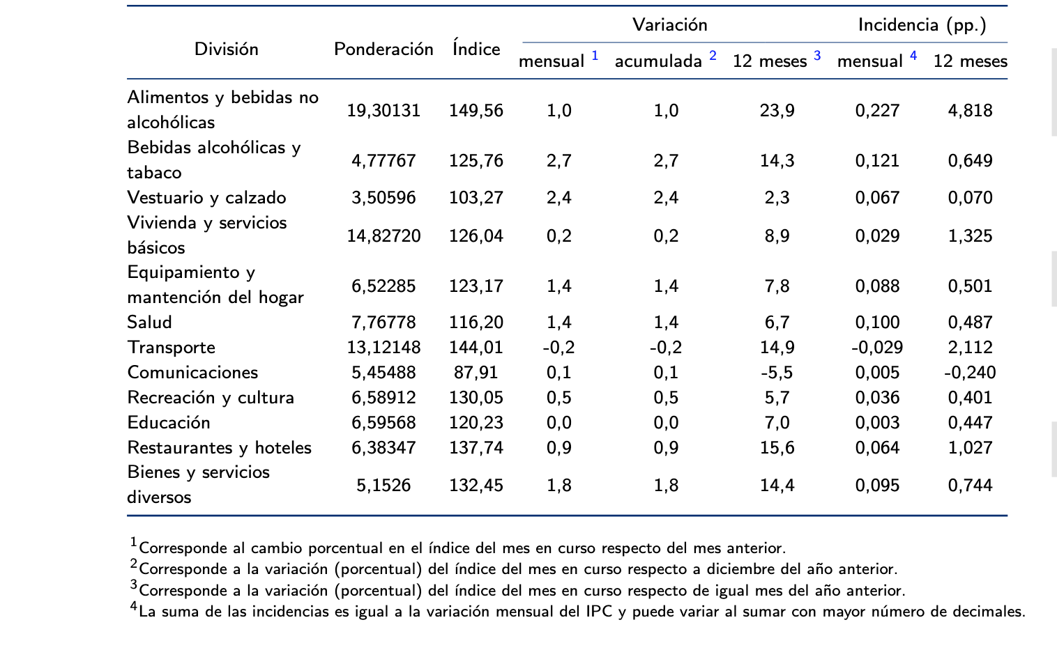 El Índice de Precios al Consumidor (IPC) anotó un aumento mensual de 0,8% en enero de 2023 llevando la variación interanual a un 12, 3%. Según informa el Instituto Nacional de Estadísticas (INE), En el primer mes del año, once de las doce divisiones que conforman la canasta del IPC aportaron incidencias positivas en la variación mensual del índice y una presentó incidencia negativa.