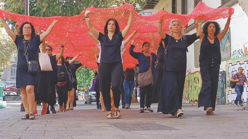 En la víspera del 8M, esta mañana mujeres caminaron por la Alameda hacia el sitio de Memoria Londres 38 portando un inmenso tejido rojo, realizando durante varios meses por distintos grupos de tejedoras y activistas.