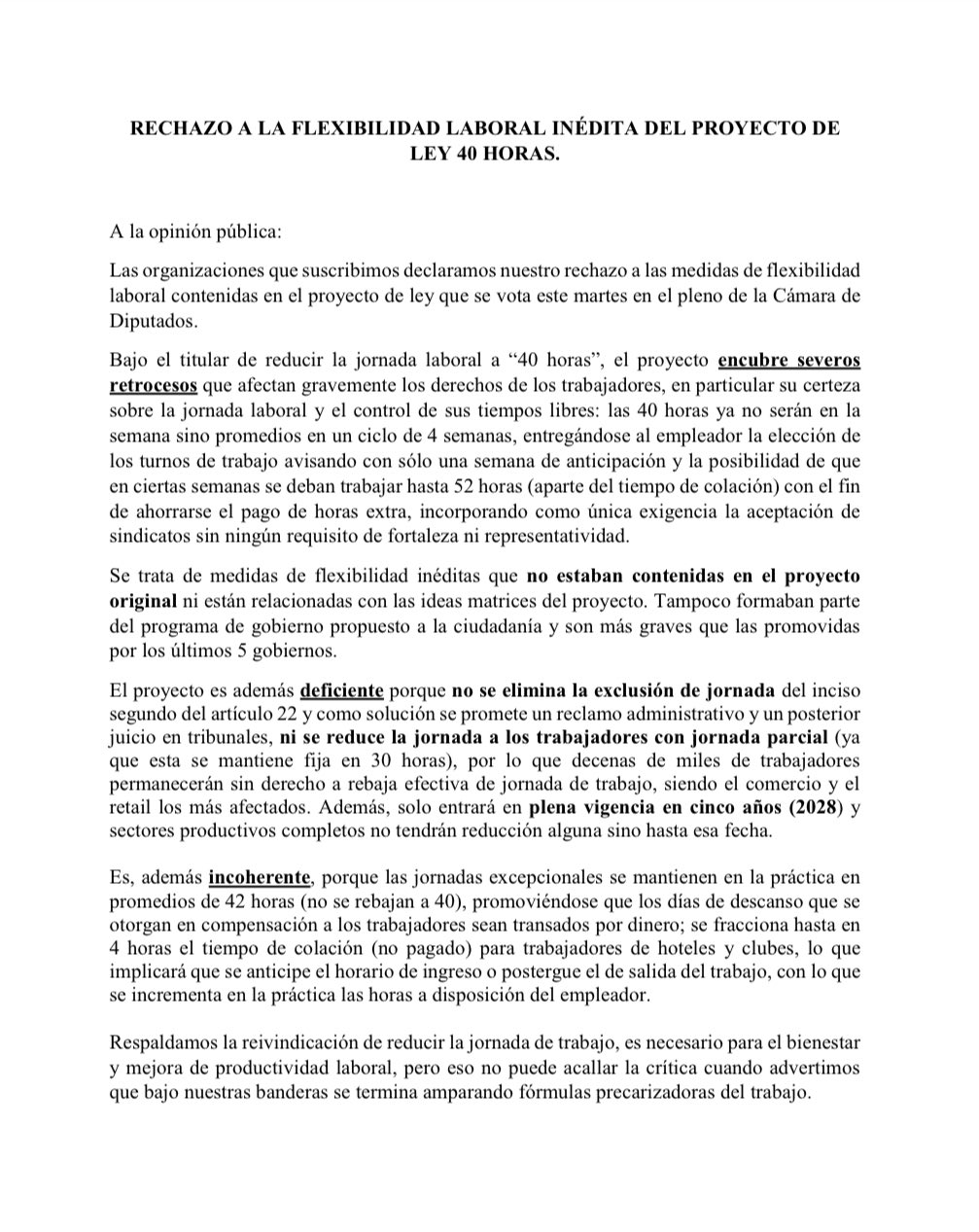 Más de diez sindicatos de la producción y los servicios criticaron la aprobación este martes por la gran mayoría de diputados y diputadas de la reducción de la jornada laboral a 40 horas semanales.