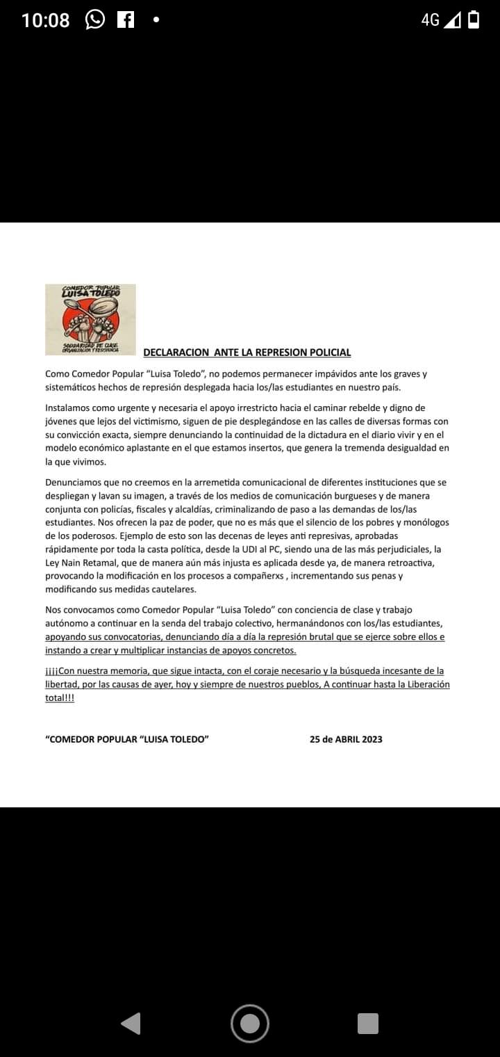 El comedor popular Luisa Toledo denunció y repudió la represión contra los y las estudiantes efectuadas por carabineros hoy amparados por la ley Naín Retamal.