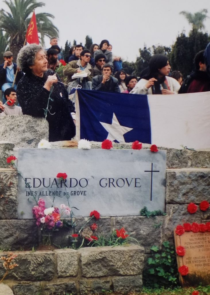 Cuando estamos frente a la tumba de la familia Grove llega mi tío Sergio, él era socialista, era Secretario del Alcalde de Viña, que también era socialista. Recuerdo que mi tío llegó de terno y con otras personas también bien vestidas. Me acuerdo que mi tío andaba con un terno negro con un pañuelito blanco en el bolsillo de arriba. En ese momento mi tío se saca el pañuelo y dice “compañeros, compañeras, el compañero Allende está enterrado acá, lo acaban de enterrar”. No sé si es mi imaginación, o es un recuerdo exacto, mi tío dice “no nos olvidemos nunca que él está acá, ahora váyanse a sus casas tranquilamente, porque no sabemos lo que puede pasar”, algo así.