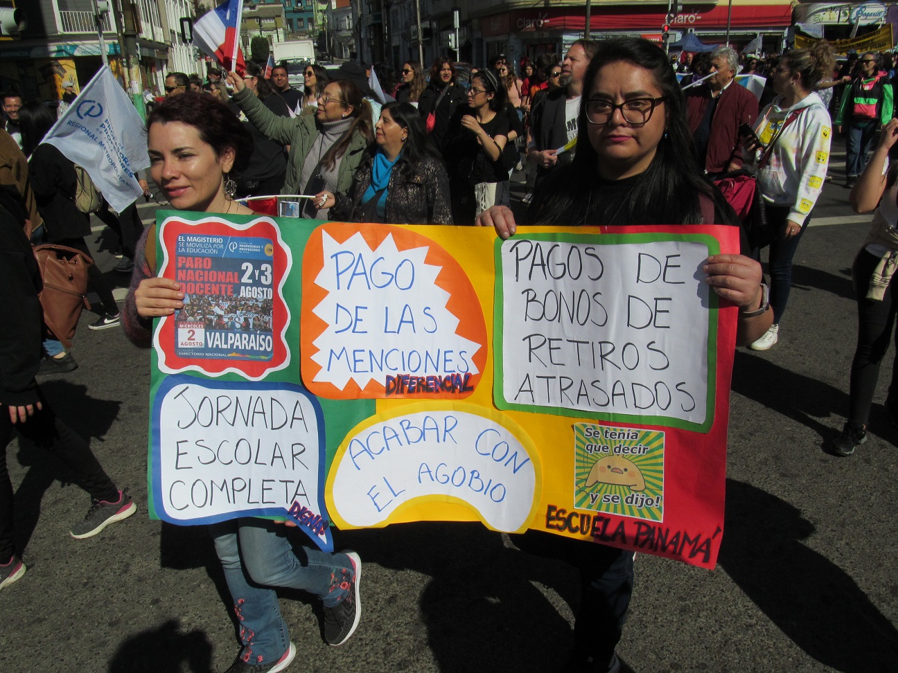 Miles de profesoras y profesores se movilizaron el miércoles en Valparaíso durante la primera jornada del Paro Nacional de 48 horas acordado por el magisterio para los días 2 y 3 de agosto. El eje central de la movilización sigue siendo la demanda general de luchar por una educación pública digna y de calidad, pero que en este caso específico se incluye un petitorio con una serie de exigencias y demandas que siguen sin ser satisfechas. En el Petitorio Nacional plantean: Reparación de la Deuda Histórica. Pago del Bono de Retiro. Pago de mención a los profesores y profesoras educadoras diferenciales. Reforma a la jornada escolar completa. Pago del Bono de Retiro después de junio del 2024. Terminar con la doble evaluación docente. Terminar con el agobio laboral.