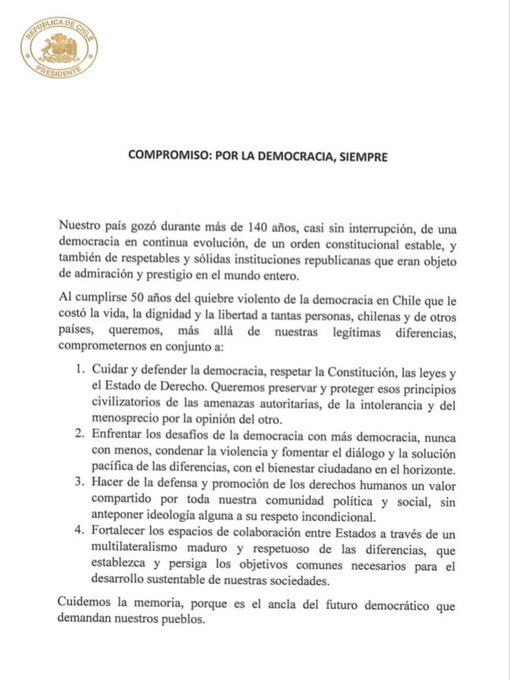 El Presidente de la República, Gabriel Boric, junto con los exmandatarios Eduardo Frei Ruiz-Tagle, Ricardo Lagos, Sebastián Piñera y Michelle Bachelet, han firmado el «Compromiso de Santiago» bajo el lema «Por la democracia, siempre». Este documento surge en el contexto de conmemoración de los 50 años del olpe de estado, el episodio que marcó profundamente a la nación y que, trágicamente, le costó la vida, la dignidad y la libertad a innumerables  chilenos y de personas de otras naciones. Más allá de sus diferencias políticas,  se han unido en un llamado conjunto para salvaguardar y fortalecer la democracia y los derechos humanos en el país. Sebastián Piñera ha firmado la declaración pese a que la coalición a la que pertenece, Chile Vamos, se ha restado.