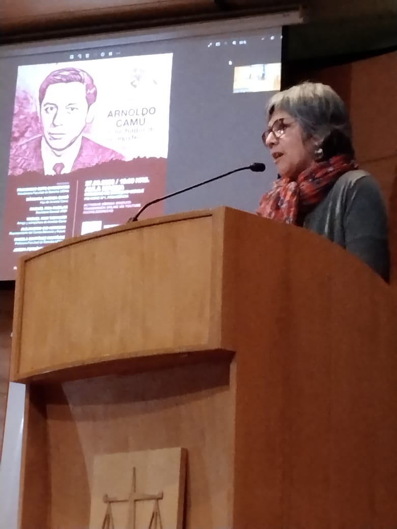 Frente a una Aula Magna repleta de jóvenes estudiantes, académicos, representantes del mundo social y de derechos humanos, hizo uso de la palabra la Directora de Extensión de la Facultad, Cecilia Domínguez, quien valoró la importancia de preservar la memoria, porque -dijo- eso habla de quiénes somos, y aporta sobre todo al debate actual.