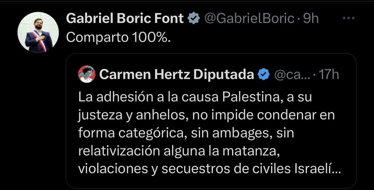 La diputada Carmen Hertz, miembro del Partido Comunista, sorprendió a muchos al distanciarse públicamente de su agrupación política a través de esa red social. Sus palabras fueron contundentes al afirmar que la adhesión a la causa Palestina no debería impedir condenar la matanza, violaciones y secuestros de civiles israelíes perpetrados por el grupo Hamas. Esta postura, en un contexto político en el que las opiniones suelen estar divididas, destacó por su claridad y firmeza al condenar los actos de violencia contra civiles israelíes.