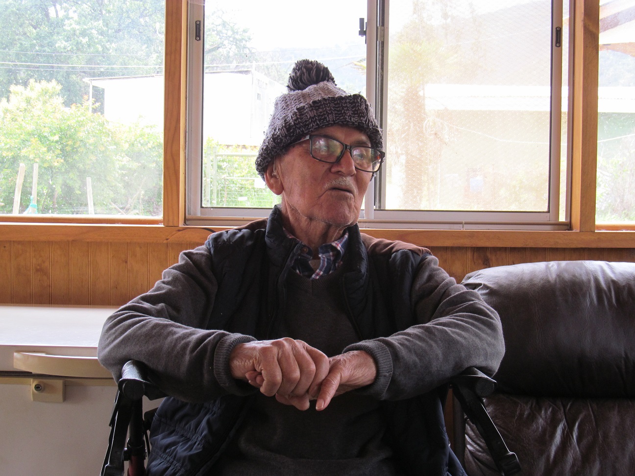 Don Carlos, de 89 años, nos recibió con una amplia y acogedora sonrisa en una sala donde tiene un quincho, sentado en una “silla-burrito” para ayudarse a caminar, ya que, como nos manifestó “me están fallando un poco las piernas, ya no las tengo como antes cuando era joven, por eso me muevo con este ‘burrito’ o con un bastón que tengo poa allí”. Nos agregó que no escuchaba muy bien por uno de sus oídos, “pero mi cabeza sigue funcionando sin problemas y todavía tengo buena memoria.“