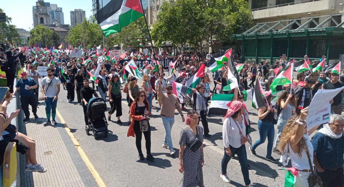 Miles de personas marcharon el sábado en Santiago para exigir el cese de los bombardeos lanzados por la Fuerza de Defensa de Israel en Gaza. La manifestación recorrió un largo tramo de La Alameda y culminó en el Paseo Bulnes, donde se realizó un acto convocado en el marco del Día Mundial de Solidaridad con Palestina.