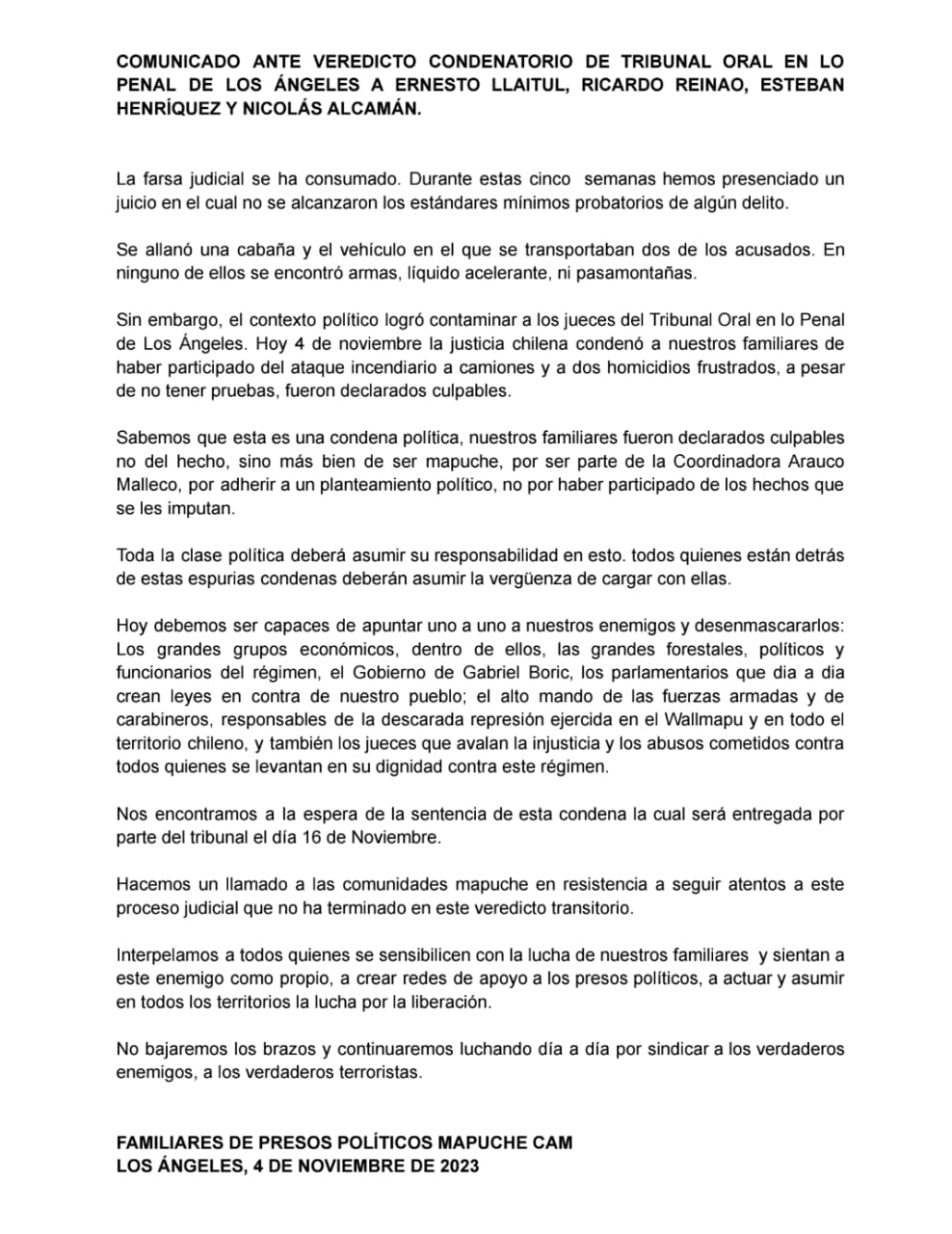 Además, el comunicado hace un llamado a la sociedad y a las comunidades mapuches en resistencia a permanecer alertas y vigilantes a medida que se desarrolle este proceso judicial. Alienta a la creación de redes de apoyo a los presos políticos y a la movilización en la lucha por la liberación. Los familiares de los condenados instan a no bajar los brazos y a seguir combatiendo por la justicia, buscando identificar a los verdaderos enemigos y responsables de la situación.