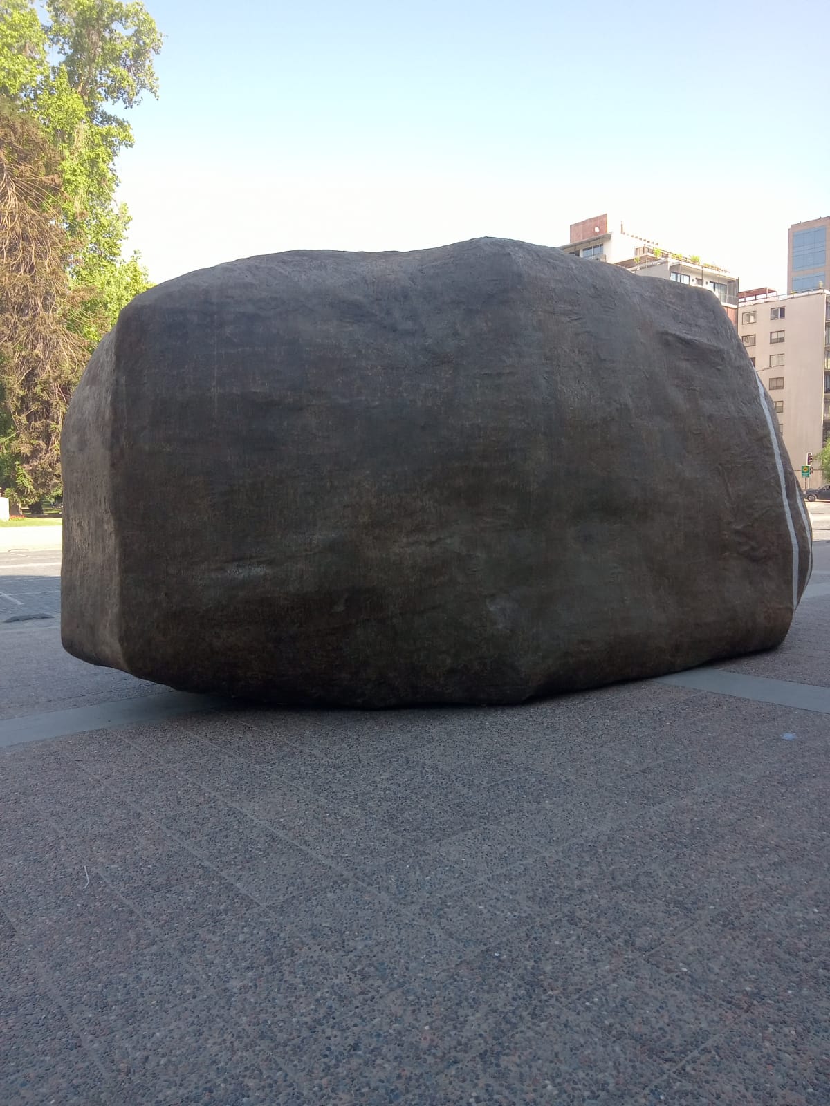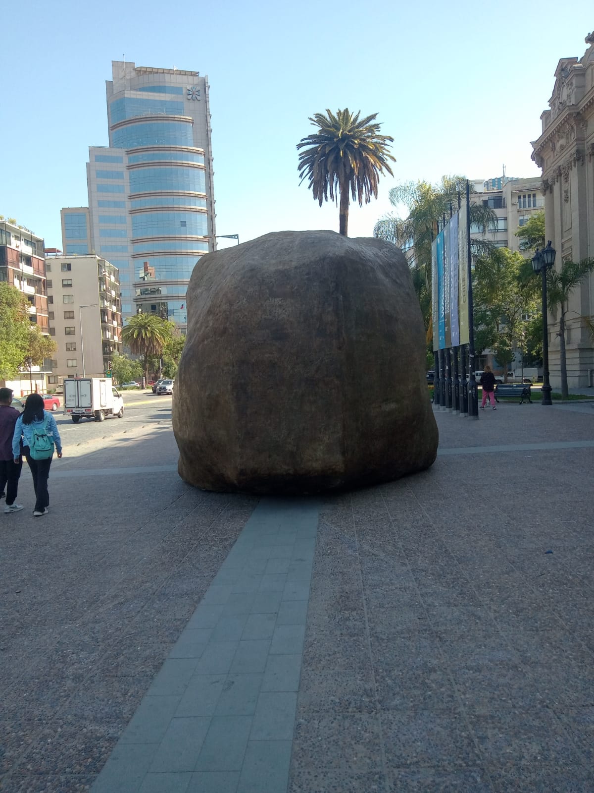Que imbecilidad más grande, señor de todos los cielos, como es posible que esta piedra nos venga a ensuciar todo lo magnífico de las obras arquitectónicas que adornan nuestro querido Santiago; es una piedra, señores turistas, no se dejen engañar por esta piedra,, solamente observen los tremendo edificios que adornan nuestra capital, y asi ustedes pueden darse cuenta de lo glorioso que es lo que el dinero puede hacer, hermosear nuestra capital, que estamos seguros que la vamos a transformar en otra Nueva York, pero, ¿una piedra? Díganme, ¿que ha hecho la madre naturaleza por nosotros? ¿Una piedra? ¿Hay algo misterioso con el tamaño de esta piedra? Naaaaá, pero, ¿podemos entender lo que esta piedra significa en nuestras limitadas existencias? Esta piedra es más hermosa y misteriosa que todos las cagadas de edificios hechos para demostrar los limitados avances de las hormigas humanas. Yo iría hasta esa piedra y pondría mi mano en su superficie , cerraría mis ojos y trataría de entender por cuantos y cuantos años esta piedra ha existido, ¿fué esta piedra parte de lo que dejó la formación de nuestro planeta? Gracias señor artista, usted y su visión ha ido más allá que la mayoría del ue vonaje que puebla este país lleno de ue vones ciegos a la realidad de la hermosura de nuestro planeta.