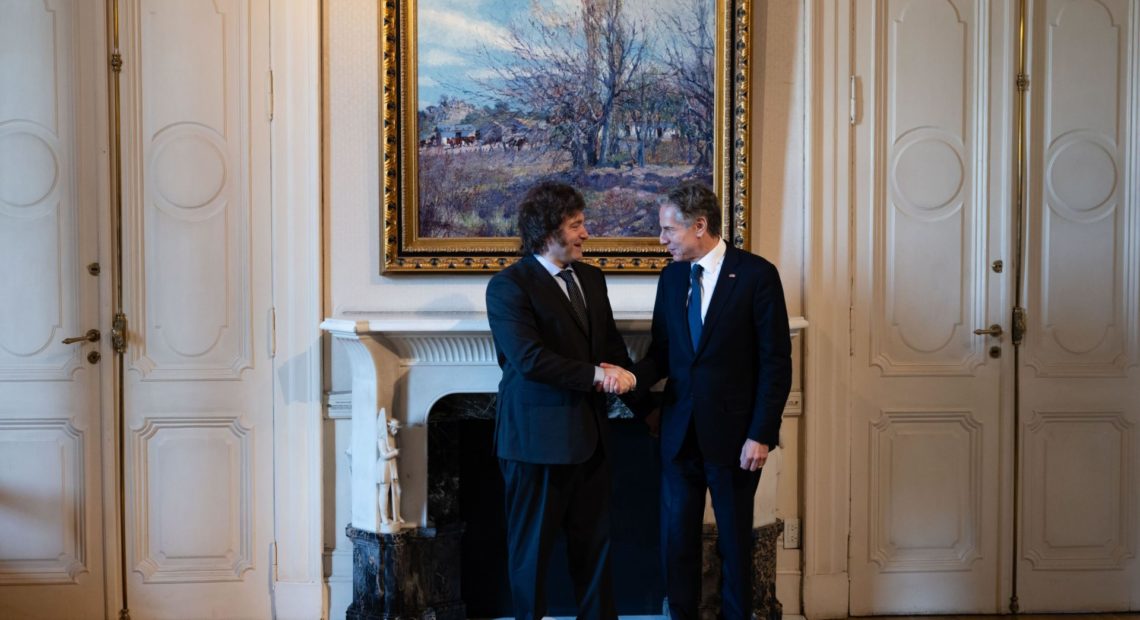 En momentos en que se realizaban 500 marchas de organizaciones sociales en esta capital y en todo el país bajo el slogan El hambre no espera, y seis gobernadores de las provincias patagónicas enviaban un ultimátum al ultraderechista presidente, Javier Milei, para que envié los fondos que les niega la nación, el mandatario se reunió ayer en la Casa Rosada con el secretario de Estado estadunidense, Antony Blinken, y otros funcionarios que llegaron anoche en visita oficial de dos días, a quienes invitó a salir al balcón de ese edificio a saludar a un grupo de turistas de varios países que recorrían la histórica Plaza de Mayo.