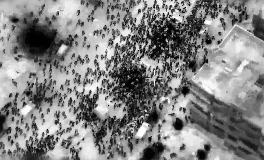 En un video israelí de vigilancia aérea nocturna, se puede ver a cientos de personas que se agolpan alrededor de al menos siete camiones en la misma zona. Las imágenes muestran cómo numerosas personas rodean los camiones y, en consecuencia, docenas perdieron la vida y o salieron heridas por los empujones, tropezones o atropelladas por los camiones