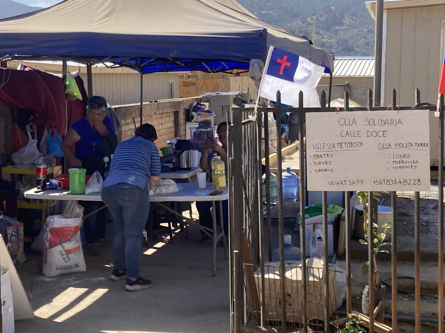 Durante la tarde recorrí otros lugares de la población y me encontré con la “Olla Solidaria Calle Doce”, que comparten alternadamente dos agrupaciones, unas son integrantes de una iglesia metodista, que se encargan de ella los días martes, jueves y sábado, mientras que los días lunes, miércoles y viernes es gestionada por las integrantes de la Olla Común Violeta Parra. Eran alrededor de las cuatro de la tarde cuando pasé por ahí y en esos momentos tres mujeres de mediana edad estaban preparando la masa para una hacer sopaipillas que repartirían, junto con leche chocolatada, más tarde a los vecinos y vecinas del sector.