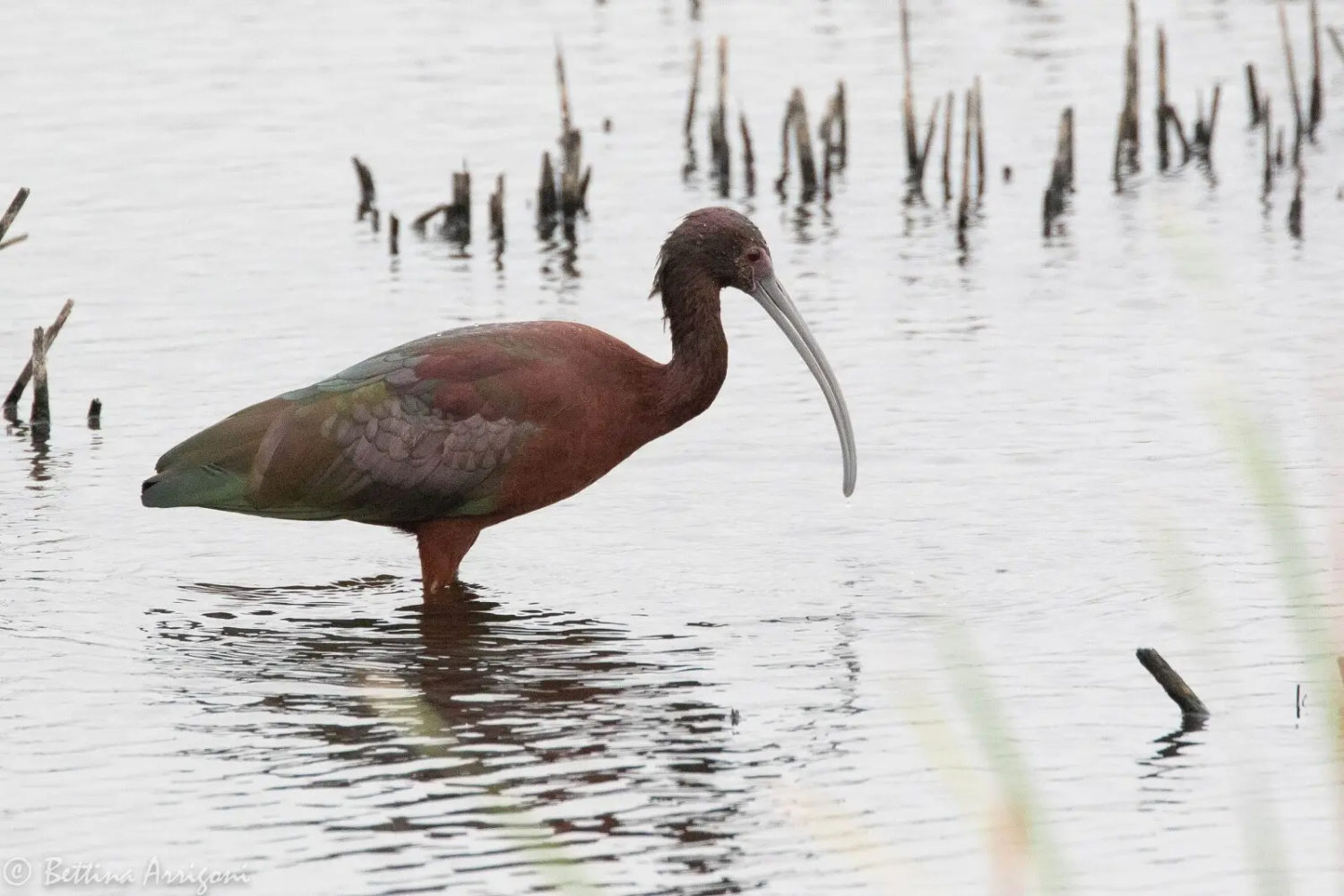 Ave en categoría de conservación casi amenazada (NT). Tiene un pico curvado, muy característico, y su cabeza, cuello y toda la parte inferior tiene una coloración castaño púrpura brillante, de dorso con reflejos metálicos. Su ala y cola pardos con reflejos verde iridiscente se lleva casi todas las miradas en los humedales. Se alimenta en la zona pantanosa que se da en la orilla de la laguna y se alimenta de lombrices, insectos e incluso algunos anfibios pequeños. Las hembras generalmente ponen los huevos (azul opaco) al mismo tiempo, entre diciembre y enero, por lo que el nacimiento de sus crías está sincronizado. Sus nidos los hacen arriba de los juncos, entre 1- 1,5 mts del suelo, para protegerse de los depredadores. Aunque en otras localidades es una especie abundante, en nuestro país avistarla no es tan común, y es que sus hábitat predilectos están desapareciendo por la disminución de la humedad.