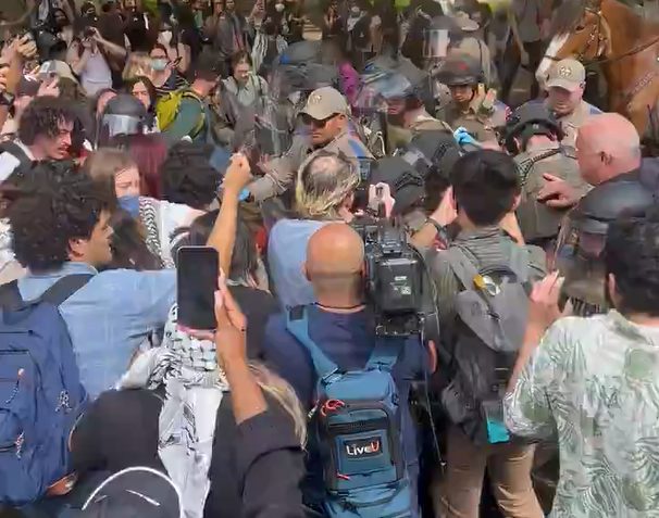 La represión se repitió ayer. En la mañana, más de 100 alumnos alzaron sus tiendas y colgaron sus carteles con consignas para protestar contra Israel, en demanda de un alto el fuego en la franja de Gaza y por desinvertir en las armas que se utilizan en esta guerra.