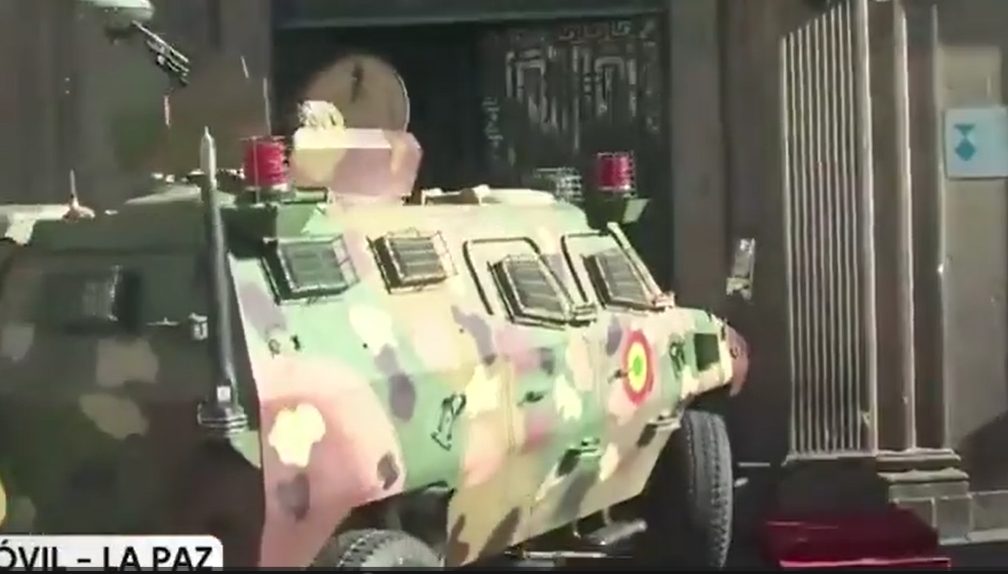 Imágenes transmitidas por el canal estatal Bolivia Tv muestran a la Policía Militar, equipada con escudos antidisturbios, impidiendo el libre tránsito de personas y utilizando gas lacrimógeno contra civiles que intentan acercarse a la Casa Grande del Pueblo.