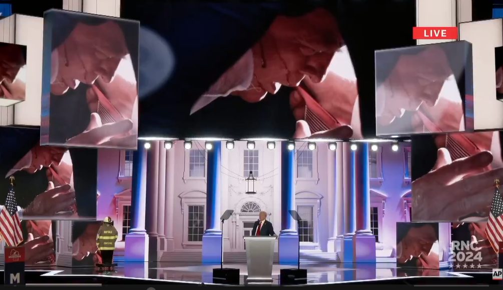 Trump apareció, con su ahora famosa oreja vendada, sobre el escenario ante los gritos de su audiencia mientras se toca una canción patriotera bendiciendo a Estados Unidos, saludando ante el delirio de su catedral política.