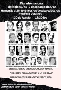 A más de 50 años del golpe civil-militar en Chile, los habitantes de Puente Alto y la Provincia Cordillera aún recuerdan a sus víctimas, rindiendo homenaje cada 30 de agosto en el “Día Internacional de las y los Detenidos Desaparecidos”. Este año, el Centro Cultural de Derechos Humanos Salvador Allende y el Comité de los 50 Años de Puente Alto llevarán a cabo un homenaje a los compañeros y compañeras desaparecidos de la provincia, en el Memorial por la Justicia y la Dignidad, Provincia Cordillera, a las 18:30 horas.