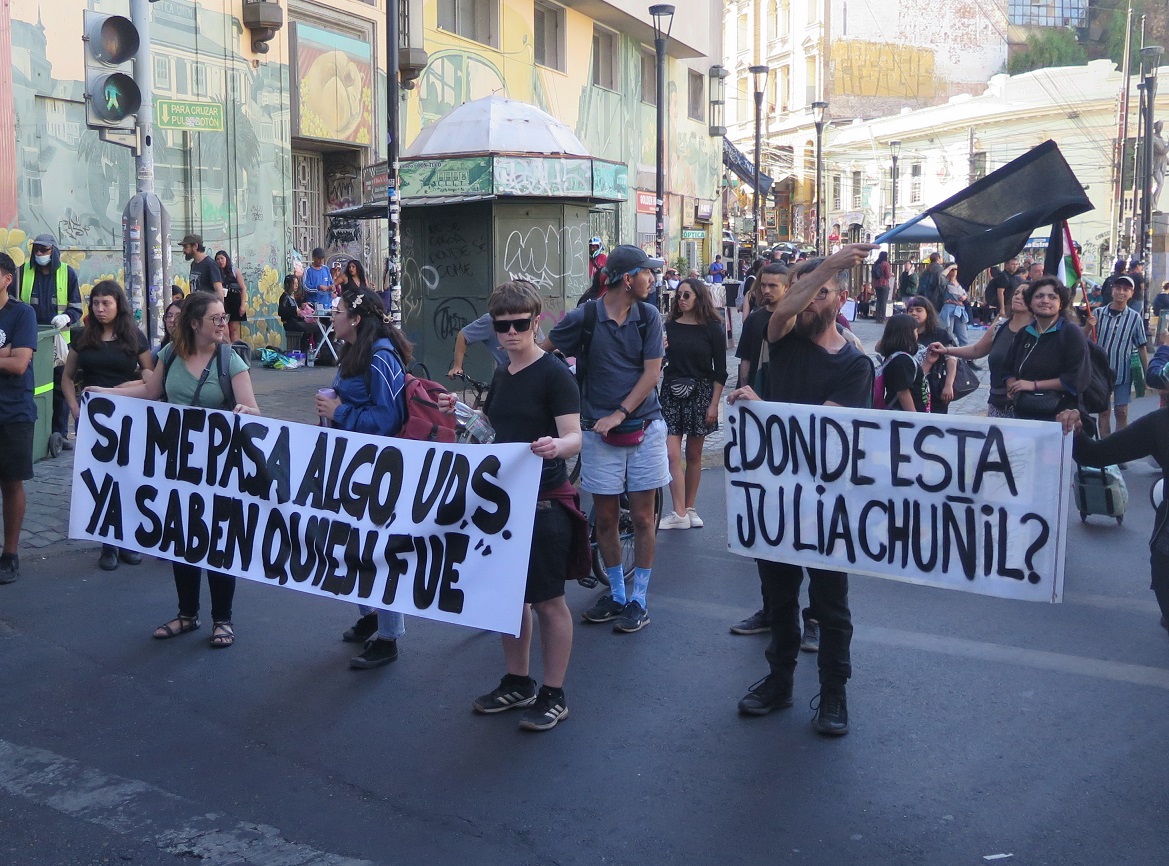“Quiero decirles que, en estos momentos a lo largo de todo Chile, así como lo estamos haciendo aquí en la plaza Aníbal Pinto en Valparaíso, hay centenares, miles de personas movilizándose por la aparición con vida deJulia Chuñil Catricura. ¡Julia Chuñil Catricura, no nos olvidemos de ee nombre!”