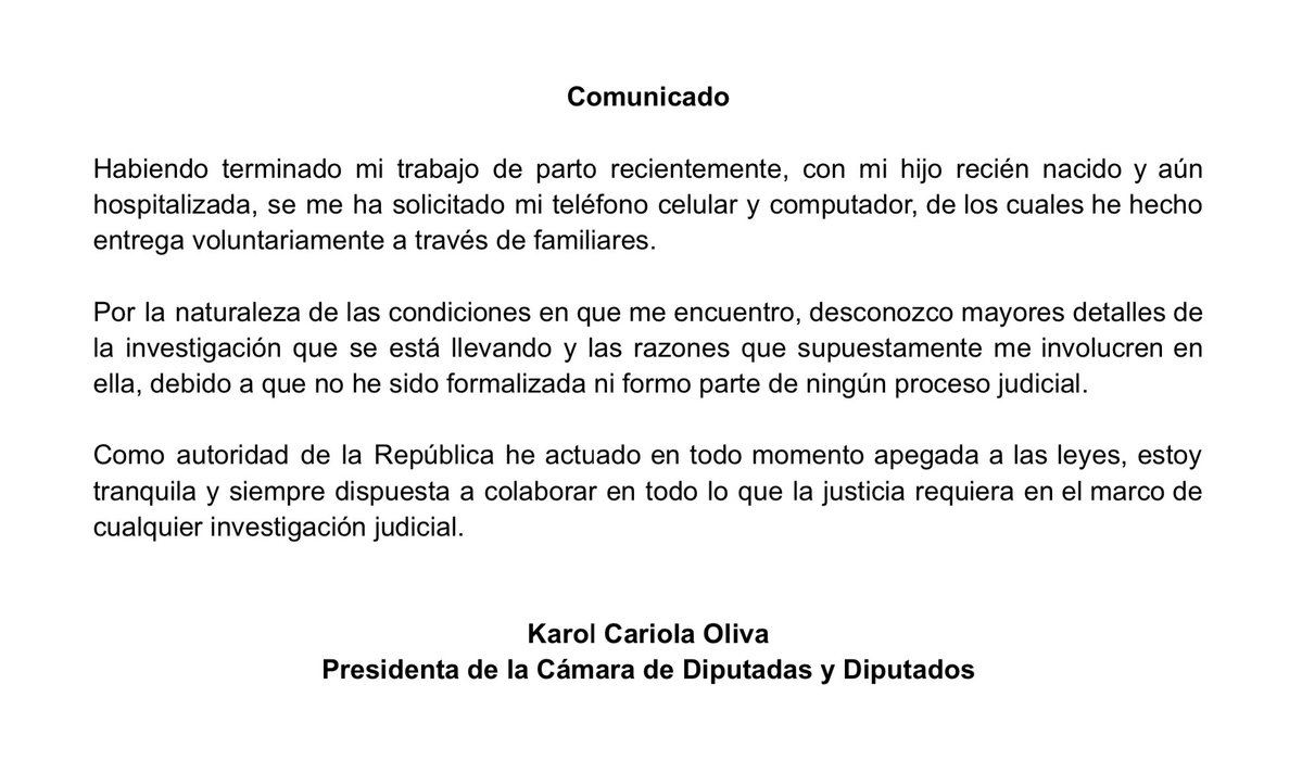 Por su parte, la jefa de bancada comunista, Lorena Pizarro, señaló que “no tengo la menor duda de que la diputada Karol Cariola estará en absoluta disposición de colaborar con todas las preguntas que le hagan al respecto”.