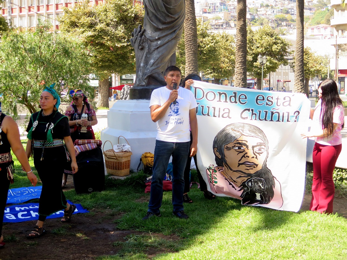 A partir de las 11 de la mañana de este sábado 8 de marzo en la plaza Victoria de Valparaíso se realizó una actividad organizada por agrupaciones mapuche de la región, al cumplirse 4 meses de la desaparición de Julia Chuñil Catricura, mujer defensora de la tierra y el medio ambiente que permanece como desaparecida desde el 8 de noviembre del año pasado.