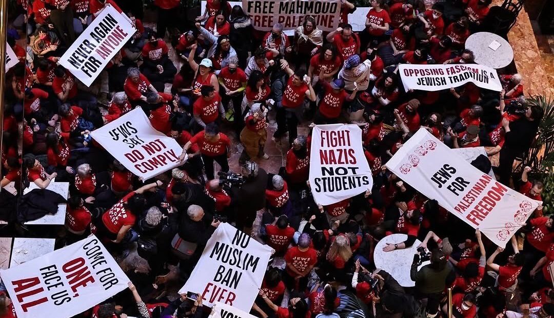 Más de 300 manifestantes tomaron por sorpresa la planta baja de la Torre Trump sobre la Quinta Avenida ayer en mañana exigiendo la liberación de un estudiante universitario palestino, colocando una manta que decía “judíos dicen liberen a Mahmoud y por una Palestina libre”, en la acción convocada por Voz Judía por la Paz, parte de una serie de acciones detonadas por la orden personal de Trump de arrestar y deportar aquellos extranjeros que participan en protestas contra la política estadunidense de apoyo a Israel.