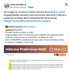 También, a través de X, Luisa González difundió lo señalado por Correa, en cuanto a que se implementó una trampa con los bolígrafos para que sus votos pasaran a Noboa, basándose en un informe de la misión de observadores de la OEA, que advierte que durante el cierre y escrutinio, la tinta utilizada para marcar las papeletas se transfería entre opciones políticas al doblarlas, lo que generó confusión e incluso anulaciones en ciertos casos.
