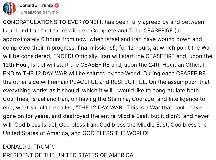 Horas después del ataque iraní, Trump anunció en su red Truth Social un cese al fuego bilateral entre Israel e Irán, que comenzaría en seis horas y duraría doce, seguido de un alto al fuego total al cumplirse 24 horas. En su habitual tono grandilocuente, el mandatario proclamó el fin de lo que bautizó como la “Guerra de los 12 días”, y felicitó a ambas partes por su “coraje e inteligencia”.