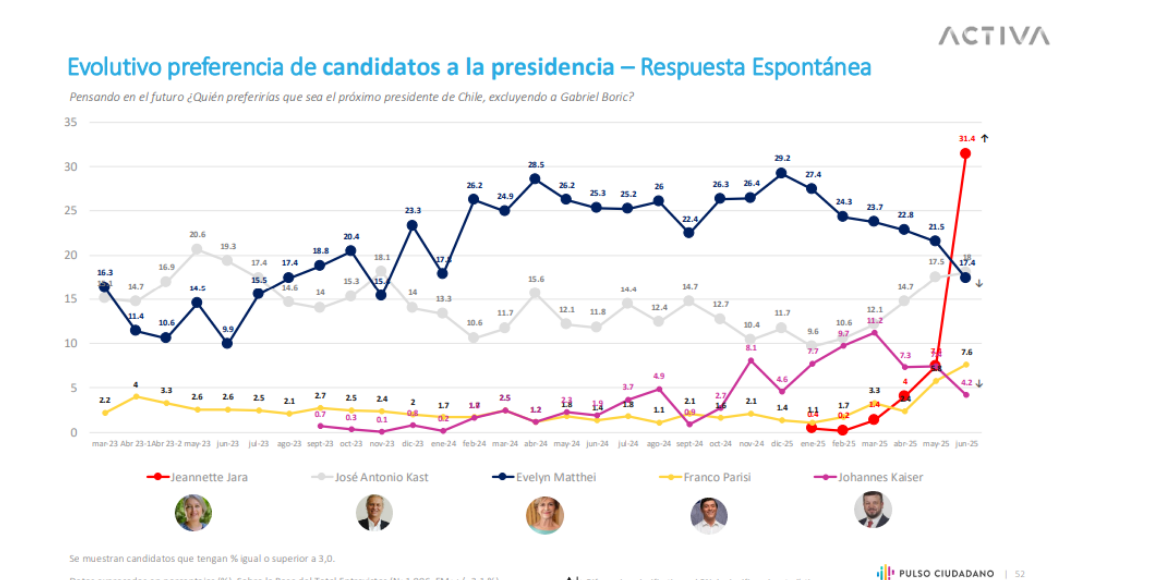 El triunfo de Jeannette Jara en las primarias del pacto Unidad por Chile sigue generando un efecto expansivo en el escenario político. La más reciente encuesta de Pulso Ciudadano, la primera realizada tras la primaria oficialista y publicada por 24 Horas, muestra a la exministra de Trabajo no solo consolidada como la figura más potente del progresismo, sino también liderando por primera vez la carrera presidencial con un 31,4% de las preferencias.