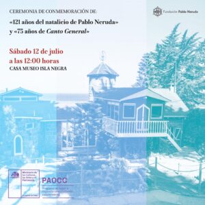 Este sábado 12 de julio, a las 12.00 horas, la Fundación Pablo Neruda conmemorará los 121 años del nacimiento de Pablo Neruda y al mismo tiempo se celebrarán los 75 años de la publicación del canto General.