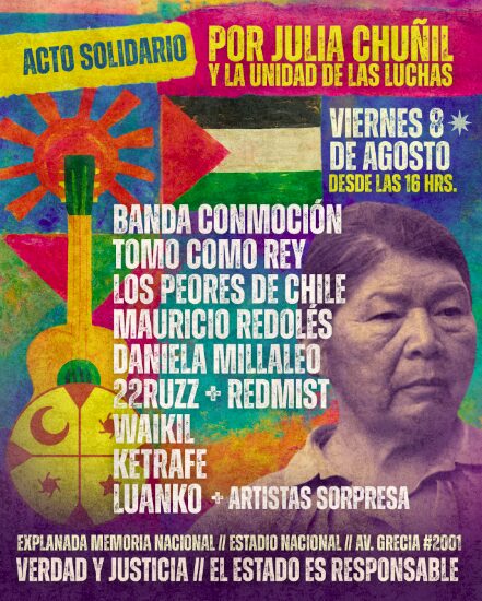 Este viernes 8 de agosto, en la explanada del Espacio de Memoria del Estadio Nacional, se realizará un acto solidario en memoria de Julia Chuñil y por la unidad de todas las luchas sociales, políticas y territoriales que hoy enfrentan una nueva oleada represiva por parte del Estado chileno. Convocado por la Asamblea por la Unidad de las Luchas y por Julia Chuñil, junto a decenas de organizaciones sociales, culturales y de derechos humanos, el evento busca visibilizar un caso que ha sido deliberadamente silenciado: la desaparición forzada de Julia, defensora del bosque nativo y de las comunidades mapuche.