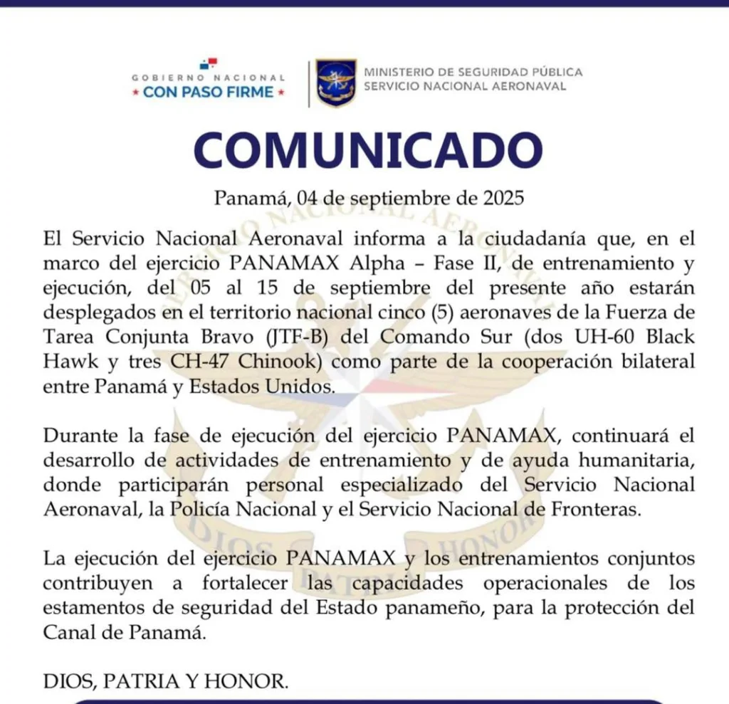 De acuerdo con información oficial del Servicio Nacional Aeronaval panameño (Senan), las maniobras denominadas Panamax Alpha-Fase II, se desarrollarán entre el 5 y el 15 de septiembre, informó Telesur. El operativo contará con la participación de cinco aeronaves de la Fuerza de Tarea Conjunta Bravo, incluyendo dos helicópteros UH-60 Black Hawk y tres CH-47 Chinook, utilizadas comúnmente para transporte táctico de tropas y carga.