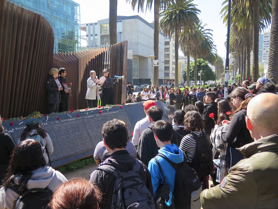 En esta ocasión voy a resaltar la romería y el acto realizado a mediodía en el Memorial de los Detenidos y Detenidas Desaparecidas, Ejecutados Políticos y Ejecutadas Políticas de la V Región, actividad en la que participaron estudiantes secundarios del Liceo Eduardo de la Barra y estudiantes universitarios de la Escuela de Teatro de la Universidad de Valparaíso, acompañados de algunas profesoras y profesores.