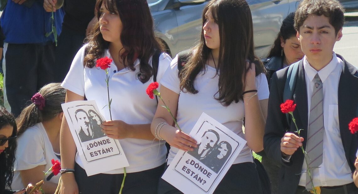 Portando pancartas de los detenidos y detenidas desaparecidas durante la dictadura civil militar y claveles rojos en sus manos, las y los estudiantes marcharon desde sus establecimientos educacionales hasta el memorial ubicado en Avenida Brasil para realizar allí un emotivo acto.