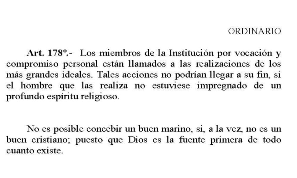 Rendón, señaló que «entre las normas indicadas en la referida Ordenanza figura, por ejemplo, el art. 178 que establece: «No es posible concebir un buen marino si, a la vez, no es un buen cristiano».
