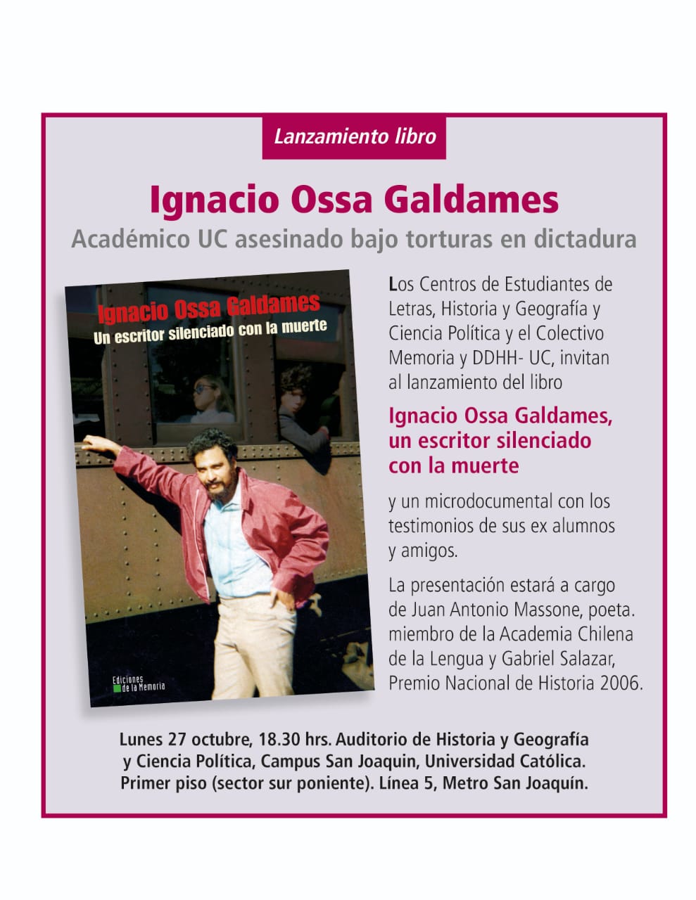 El lanzamiento ha sido organizado por los centros de estudiantes de Letras, Filosofía, Historia y Geografía, Ciencia Política, junto al Colectivo Memoria y DD.HH. – UC. La jornada contará con música y un micro documental con testimonios de exalumnos y amigos del académico.