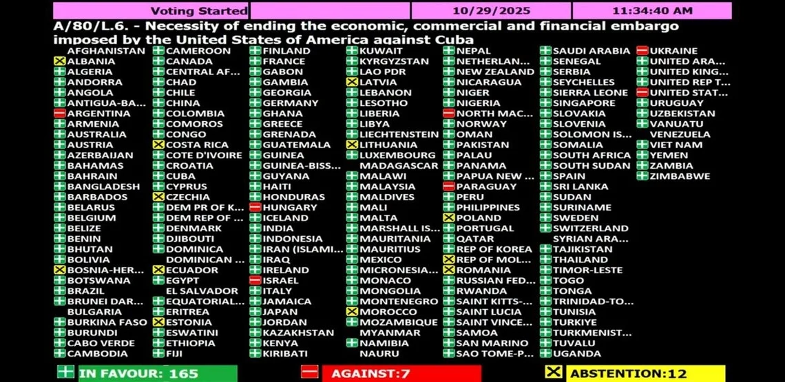 La Asamblea General de la Organización de Naciones Unidas (ONU) votó de forma abrumadora para condenar el bloqueo económico impuesto por Estados Unidos a Cuba por trigésimo tercer año consecutivo, con 165 votos a favor, siete en contra y 12 abstenciones.