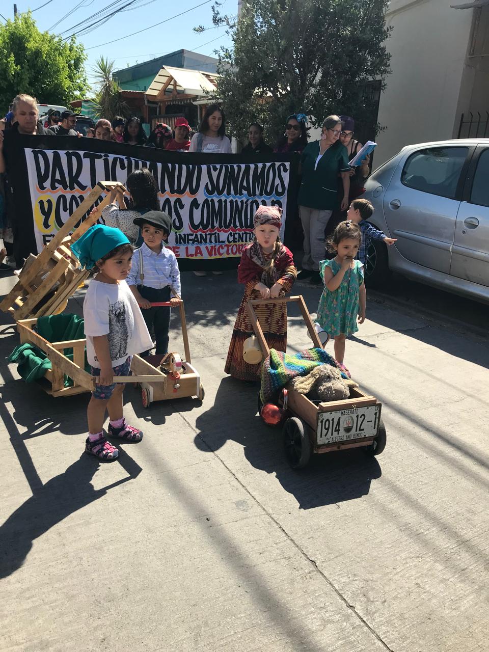 “¡Vamos a la Toma!” “¡Juventud y gloria, La Victoria!”, corean una veintena de niños y niñas junto a sus apoderados y educadores de párvulos mientras desfilan por las calles de su barrio, durante la mañana del pasado 30 de octubre.