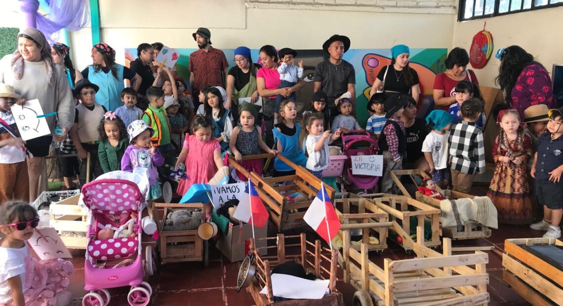 Ronald, quien llegó hace cinco años del Perú, es padre de una niñita de tres años, alumna del Jardín. En el Perú fue técnico de iluminación cinematográfica; en Chile vende cosas en la feria libre para mantener el hogar que comparten ocho familiares. Observa a los pequeños – bigotes pintados en sus rostros y vestidos a lo antiguo, empujando carretones diminutos fabricados por los respectivos padres y madres. Dice: “Vivir en este barrio es para mí una experiencia nueva y bonita. Como tenemos una hijita chilena, nos sentimos parte de esa época también”.