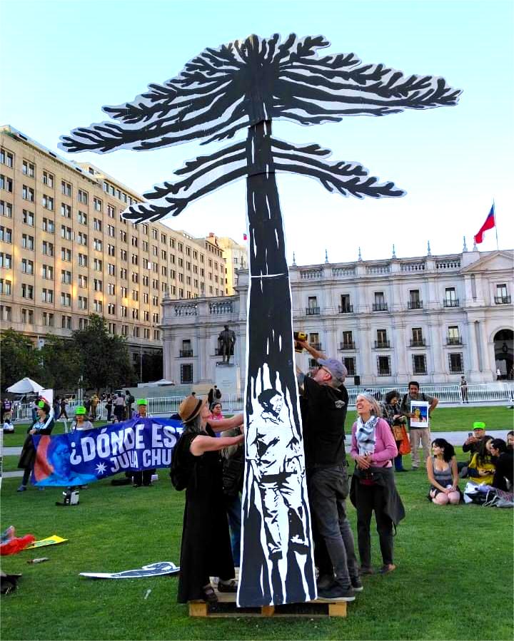 JCH:  El desempeño de la justicia y en general de la institucionalidad del Estado en este caso es revelador de su carácter patriarcal. Pasó un año y pese a los claros indicios respecto de responsabilidad de terceros (“Si algo me pasa ya saben quien fue” expresaba JCH, y eso fue transmitido por la familia a la fiscalía) no hay resultado sobre dónde está, ni los responsables del crimen. Para los fiscales y los grandes medios de comunicación ella no existe, es apenas una mujer del campo, no es noticia. Y los jueces de Valdivia y de la Corte Suprema negaron amparo a la hija de Julia, porque es una mujer mapuche, pobre, y puede ser allanada, presionada y tratada con violencia.  Pero la existencia de registros documentales del cineasta Víctor Gutiérrez, de CauCau Films ha logrado que JCh sea conocida por los pueblos en su dimensión de mujer mapuche orgullosa de sus ancestros, defensora de su territorio, huertera, defensora del bosque y de la semilla antigua. Fue capaz de criar y educar a todos sus hijos para luego regresar a su territorio y criar también nietos, practicando el buen vivir tras haber vivido el despojo, la pobreza extrema y la incesante discriminación. Ella logró organizar una comunidad con la que inició el proceso de recuperación de la tierra ancestral y fue insobornable en la defensa de su tierra (“De aquí nadie me saca” dice en el video Chew Muley J.Ch). En tiempos marcados por la apatía y el repliegue de quienes tiempo atrás poblaban las calles en marchas multitudinarias, la pregunta “Dónde Está JCh” ha convocado y re-unido de forma especial en todo Chile a centenares de mujeres de todo tipo de organizaciones populares, mapuche y no mapuche y también a luchadores jóvenes y mayores de organizaciones de DDHH, socioambientales y de la cultura. Asimismo la nieta de J.Ch, Lyssette, ha ido recogiendo el legado de su abuela, y transformándose en una guerrera que no descansará hasta lograr que Julia pueda descansar en su tierra. Porque ella abraza ahora esa lucha de defensa de su territorio.