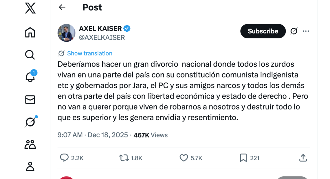 El mensaje en X del abogado Axel Kaiser, donde propone un «gran divorcio nacional» segregando el país entre «zurdos» confinados en un territorio con una constitución «comunista indigenista» gobernada por figuras de izquierda y supuestos aliados narcos, y el resto disfrutando de libertad económica y estado de derecho, no es más que una incitación a un apartheid ideológico que evoca las peores prácticas de segregación histórica.